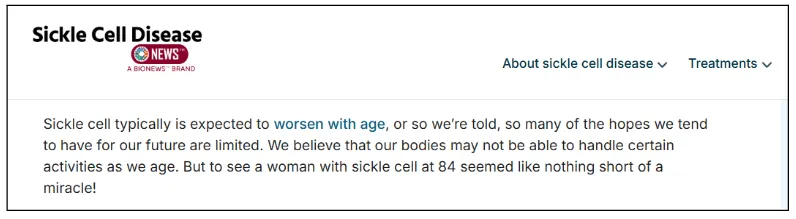 Just like this 84yrs old woman, you don’t need to fear that Sickle Cell Disease will result in a shortened lifespan for you or your loved one.